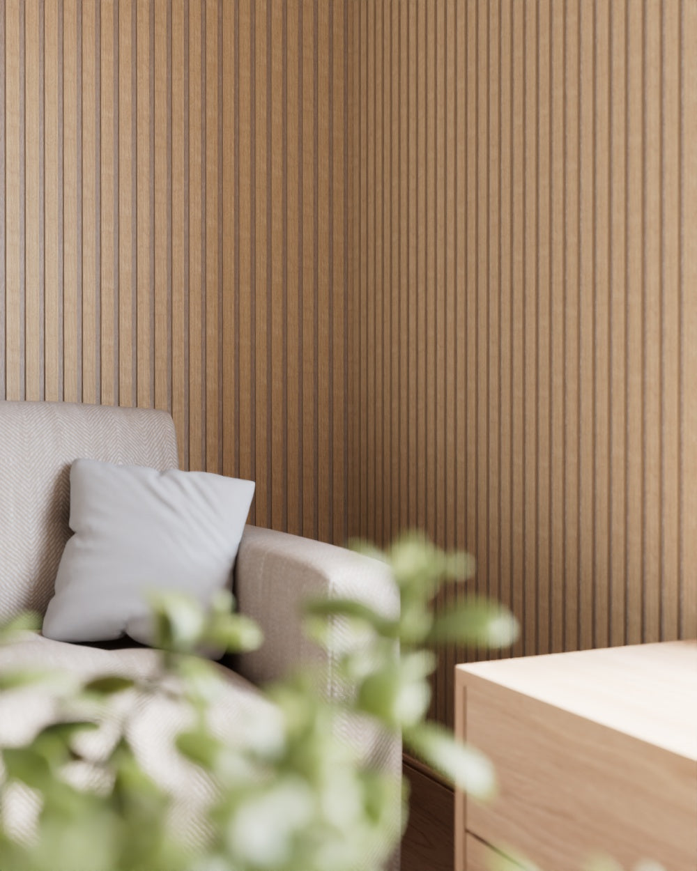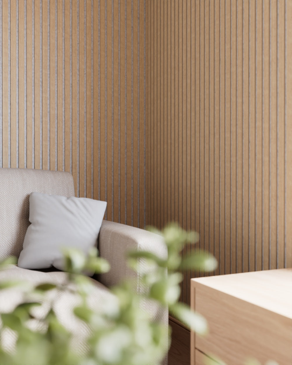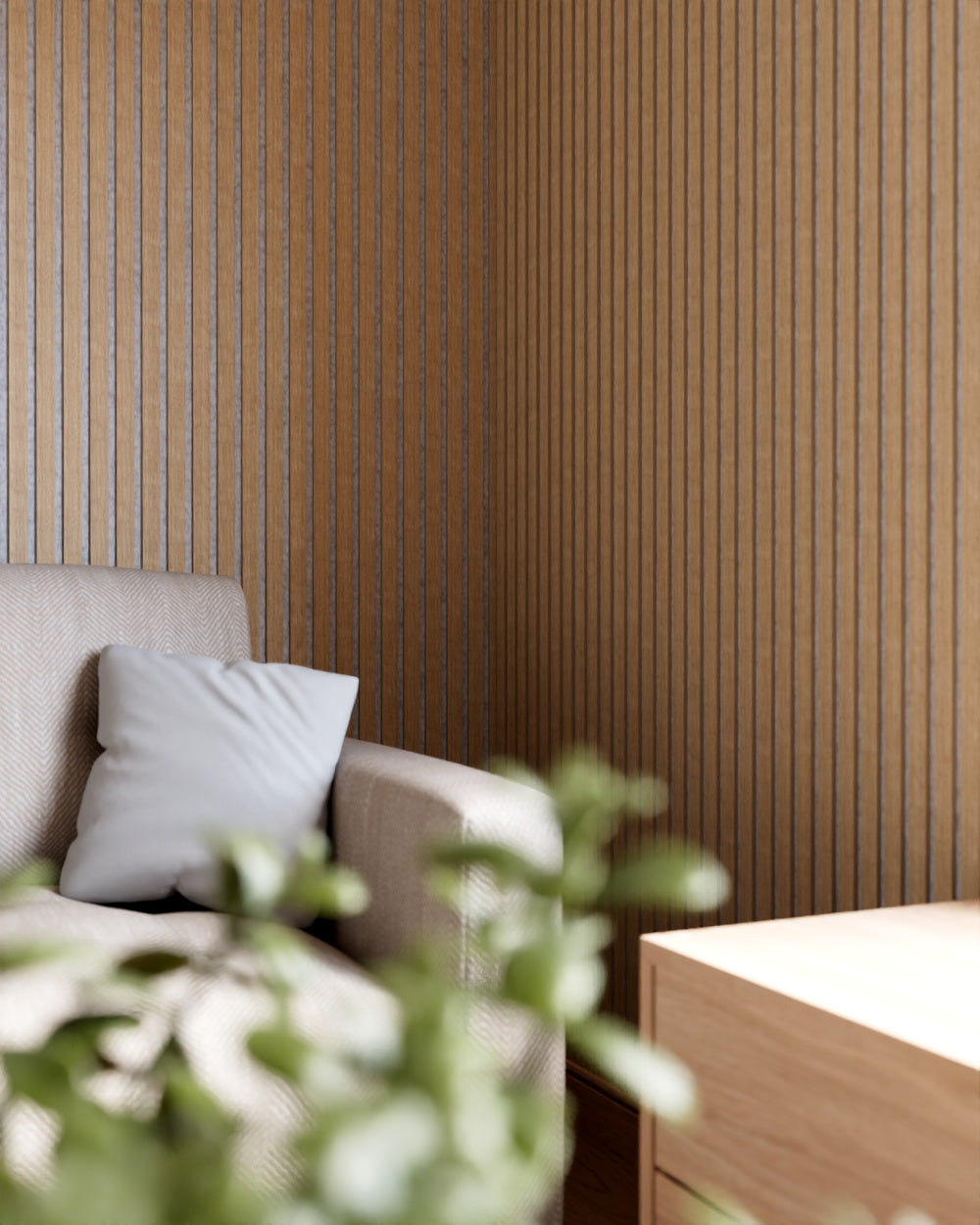 Unsere Akustik Paneele Leicht bestehen hingegen aus Technischem Furnier welches aus verschiedenen Holzarten zusammengesetzt und dann gefärbt oder so verarbeitet, dass es eine einheitliche Maserung und Farbe hat. Das sorgt für eine gleichmäßige Optik, die sich perfekt für moderne und minimalistische Designs eignet. Der Vorteil hier: Du erhältst eine gleichbleibende Qualität und Optik, ohne Überraschungen in Farbe oder Maserung.