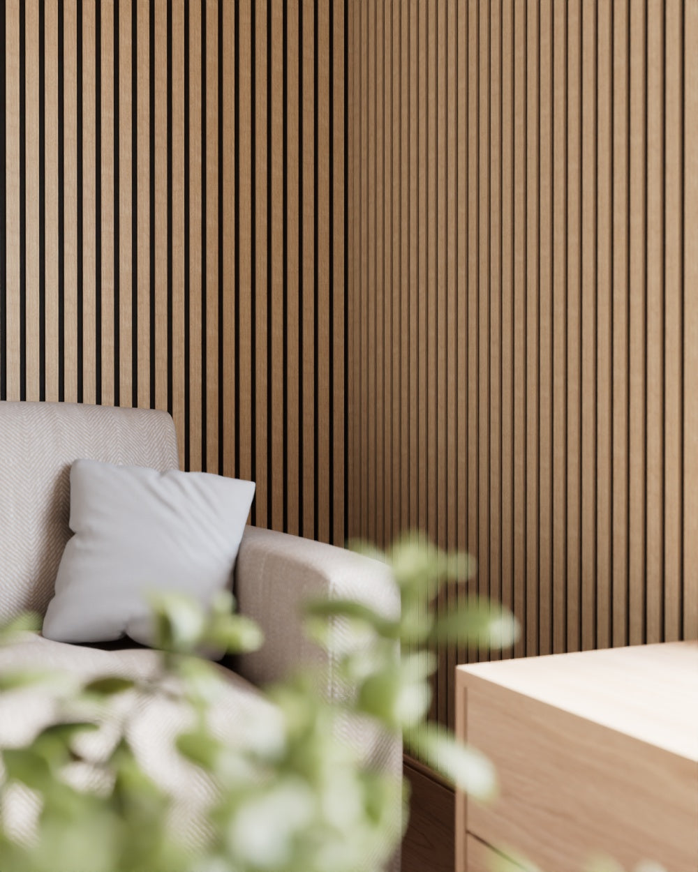Die Furnierschicht, die auf den Akustikpaneelen angebracht ist, ermöglicht eine einheitliche Holzoptik verschiedener Holzarten. Von edlem Eichen- bis zu aufwendig geölten Oberflächen - in Kombination mit der Akustikfunktion schafft dies eine angenehme und harmonische Atmosphäre in jedem Raum.