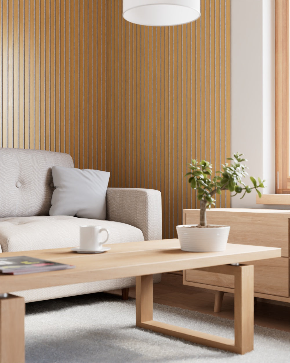 Das Akustikpaneel Trendig vereint stilvolles Design mit einer pflegeleichten Oberfläche – perfekt für dein modernes Zuhause! Erhältlich in Eiche Natur und Eiche Geölt, bringt es den zeitlosen Charme von Holz in deine vier Wände.