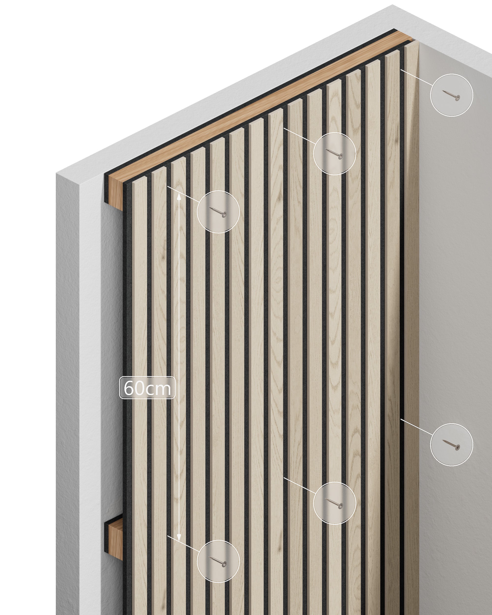 Om geluidsabsorptieklasse A (beste absorptieklasse) te bereiken, moeten de akoestische panelen op 45 mm dikke balken worden gemonteerd met 45 mm dikke isolatie achter de panelen. De balken